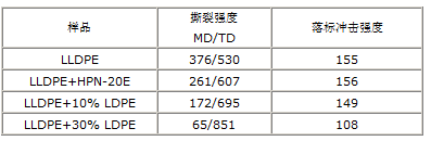 含有HPN-20E的LLDPE膜的撕裂強度和沖擊性能比LLDPE/LDPE混合物都好。